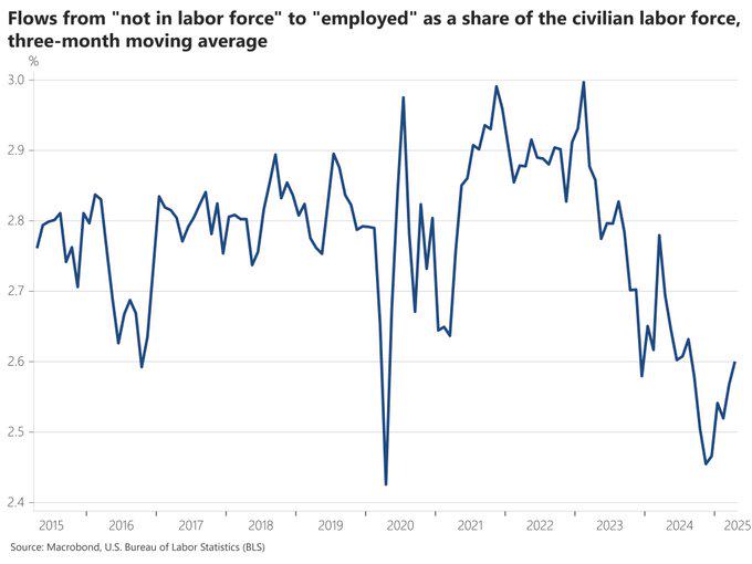 最近,那些原本不在劳动力市场(既未工作也未找工作)的人转而就业的人数有所回升,这一趋势与去年秋季美联储的降息相吻合。