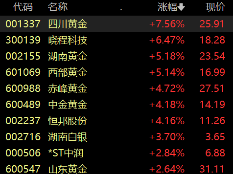 四川黄金涨超7%,湖南黄金、西部黄金涨超5%,赤峰黄金、中金黄金、山东黄金等跟涨。