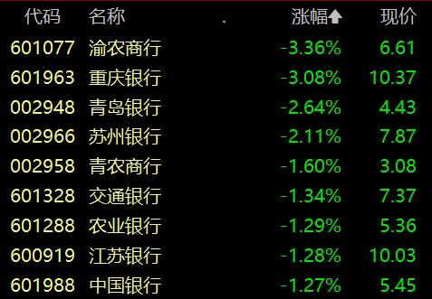 渝农商行、重庆银行跌超3%,青岛银行、苏州银行跌超2%,交通银行、农业银行、江苏银行等走低。