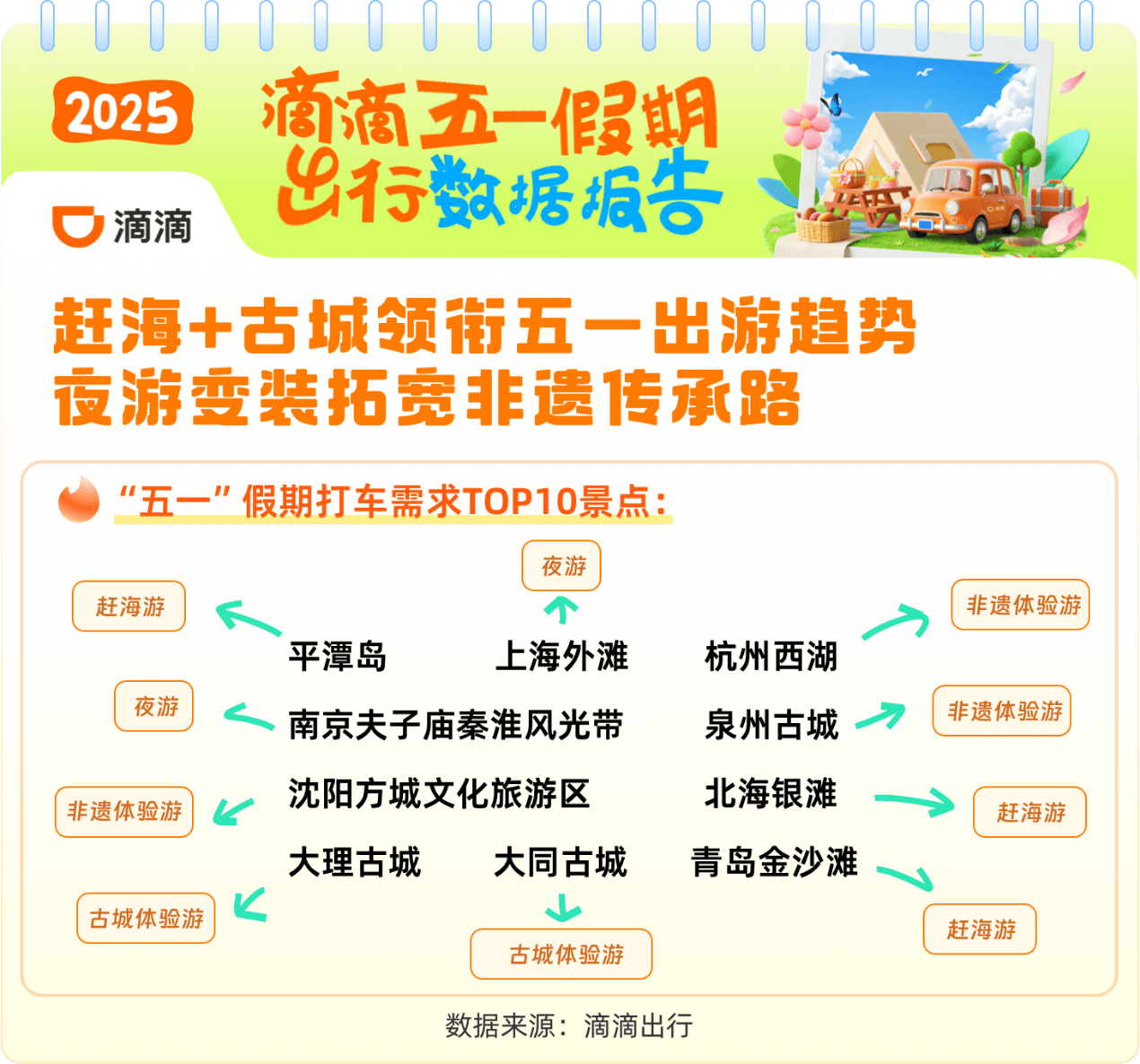 这个假期,非遗深度体验出圈。滴滴出行数据显示,前往古城古镇古街的打车需求同比去年上涨46%,其中泉州古城、大理古城、大同古城进入五一全国打车需求前十景点。不少景区推出夜间深度游活动,具有灯光造景、非遗集市、沉浸式演绎等夜游核心吸引物的文旅街区打车需求火爆。长沙太平老街历史文化街区、唐山河头老街、无锡清名桥历史文化街区、南京夫子庙秦淮风光带、西安大唐不夜城等夜间打车需求占比过半。