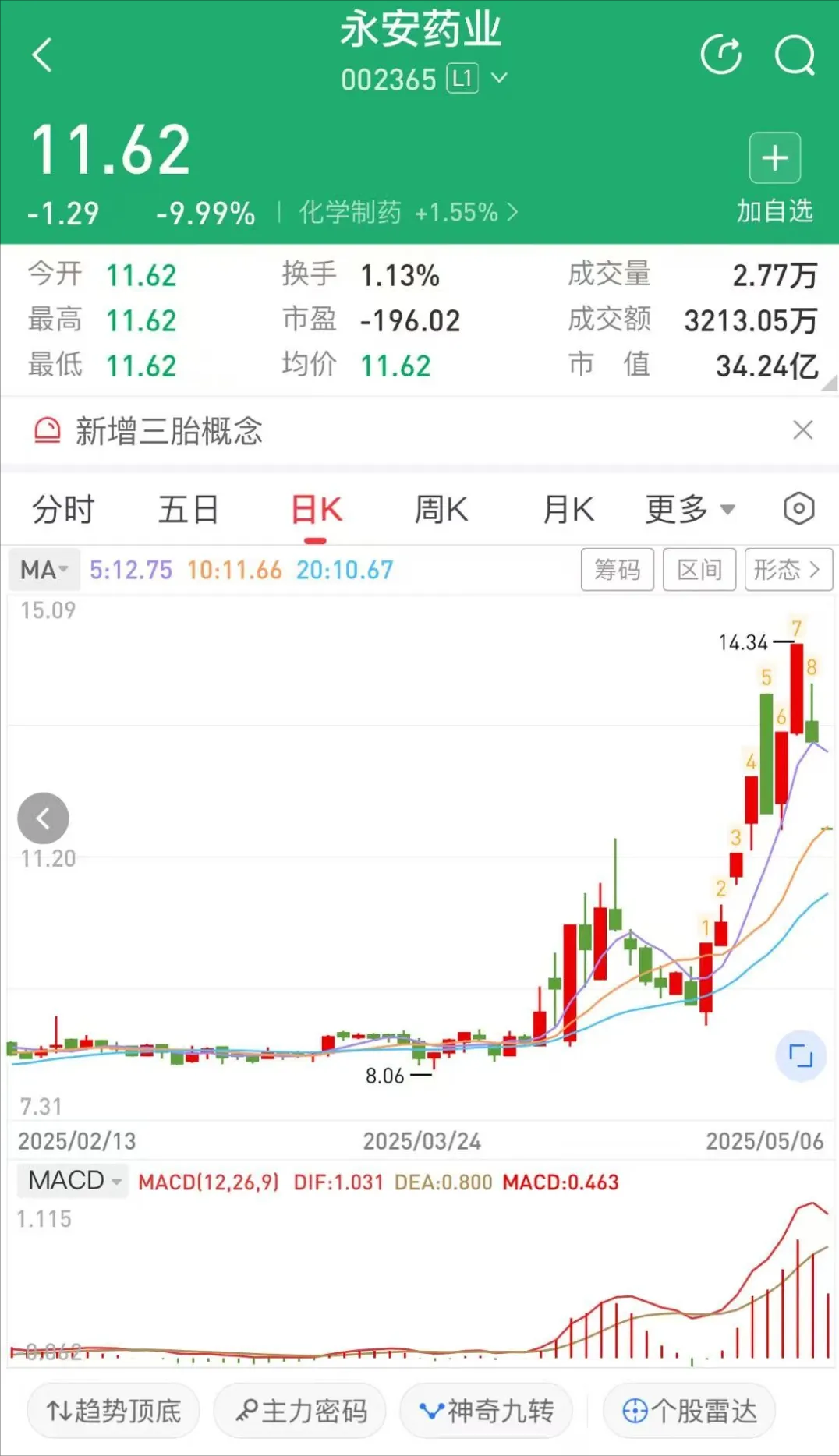 5月6日,前7个交易日实现5个涨停板的永安药业,开盘一字跌停。消息面上,最大的冲击是5月5日,其发布的公告显示,由于涉嫌违法行为,实际控制人、董事长陈勇已被立案调查并实施留置。
