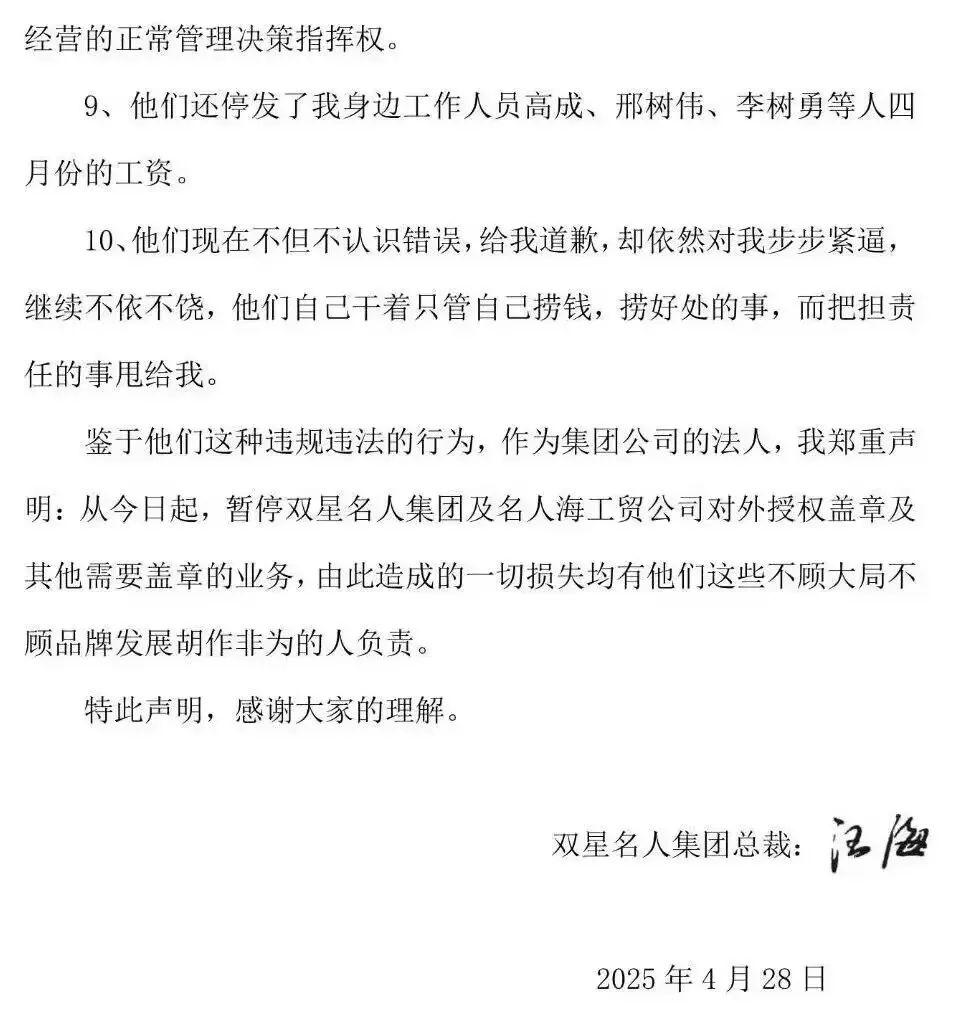 公开信表示,“作为集团公司的法人,我郑重声明:从今日起,暂停双星名人集团及名人海工贸公司对外授权盖章及其他需要盖章的业务,由此造成的一切损失均由他们这些不顾大局不顾品牌发展胡作非为的人负责”。