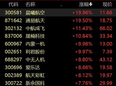 晨曦航空涨停,通易航天涨超19%,中航成飞、内蒙一机等多股跟涨。