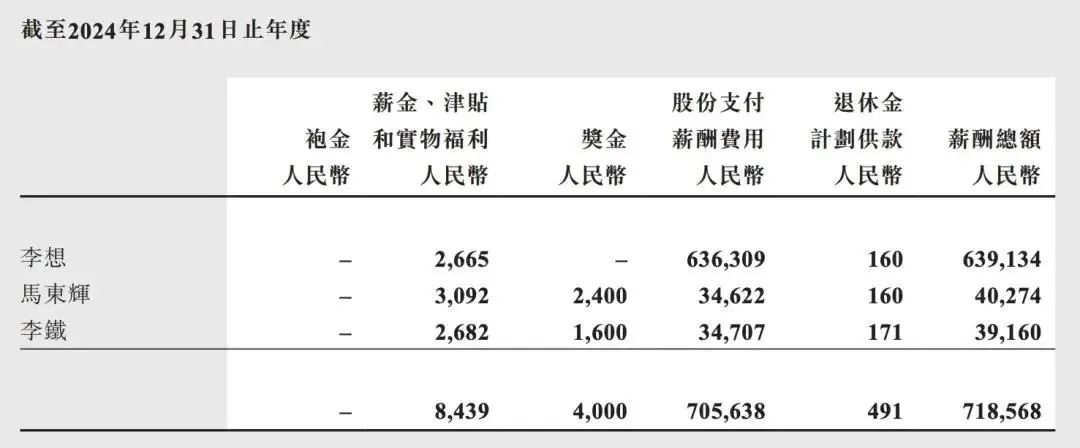 理想汽车执行董事兼总裁马东辉、理想汽车CFO李铁两者年薪分别为4027.4万元、3916.0万元,比2023年低了不少。