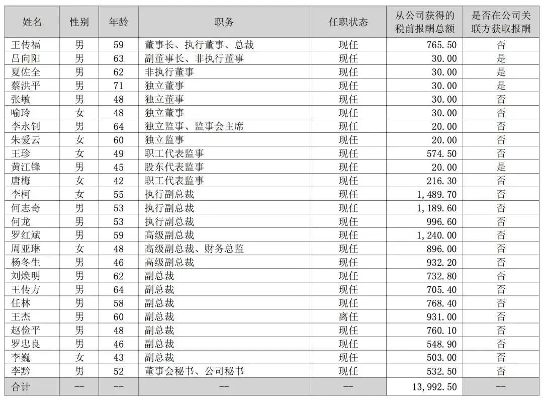 财报显示,董事长、执行董事、总裁王传福税前报酬总额765.5万元,在公司高管中排名第9,薪酬最高的是执行副总裁李柯,达1689万元,执行副总裁罗红斌、高级副总裁何志奇税前工资同样均超千万元。