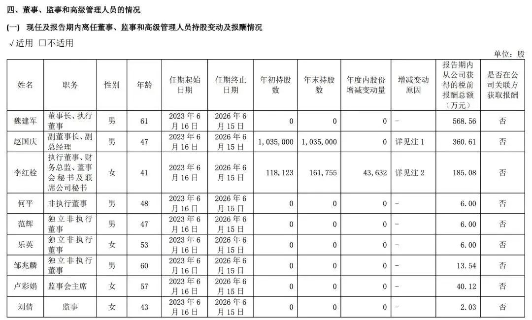 长城财报显示,长城汽车董事长魏建军全年薪酬568.56 万元,与2023年持平,长城汽车副总经理、副董事长赵国庆为360.61万元,长城汽车执行董事李红栓则为185.08万元。