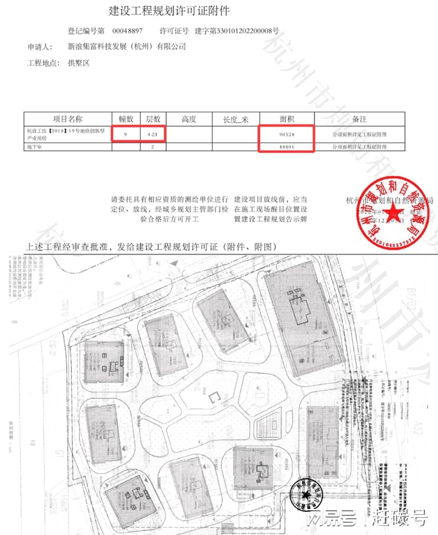 杭州市规划和自然资源局官网公示的“建设工程规划许可证”信息显示,该项目名称为“杭政工出【2018】19号地块创新型产业用房”,建设规模为139329平方米,共有9幢建筑,层数为4层-21层不等。