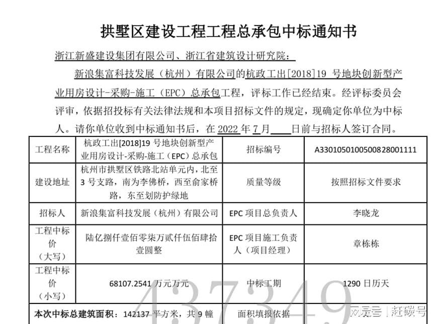 2022年6月21日,项目招标代理人发布项目总包中标公告,浙江新盛建设集团有限公司、浙江省建筑设计研究院以6.81亿元中标。