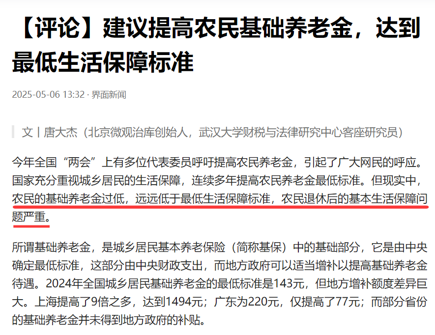 近日,武汉大学财税与法律研究中心客座研究员唐大杰建议提高农民基础养老金,达到最低生活保障标准。