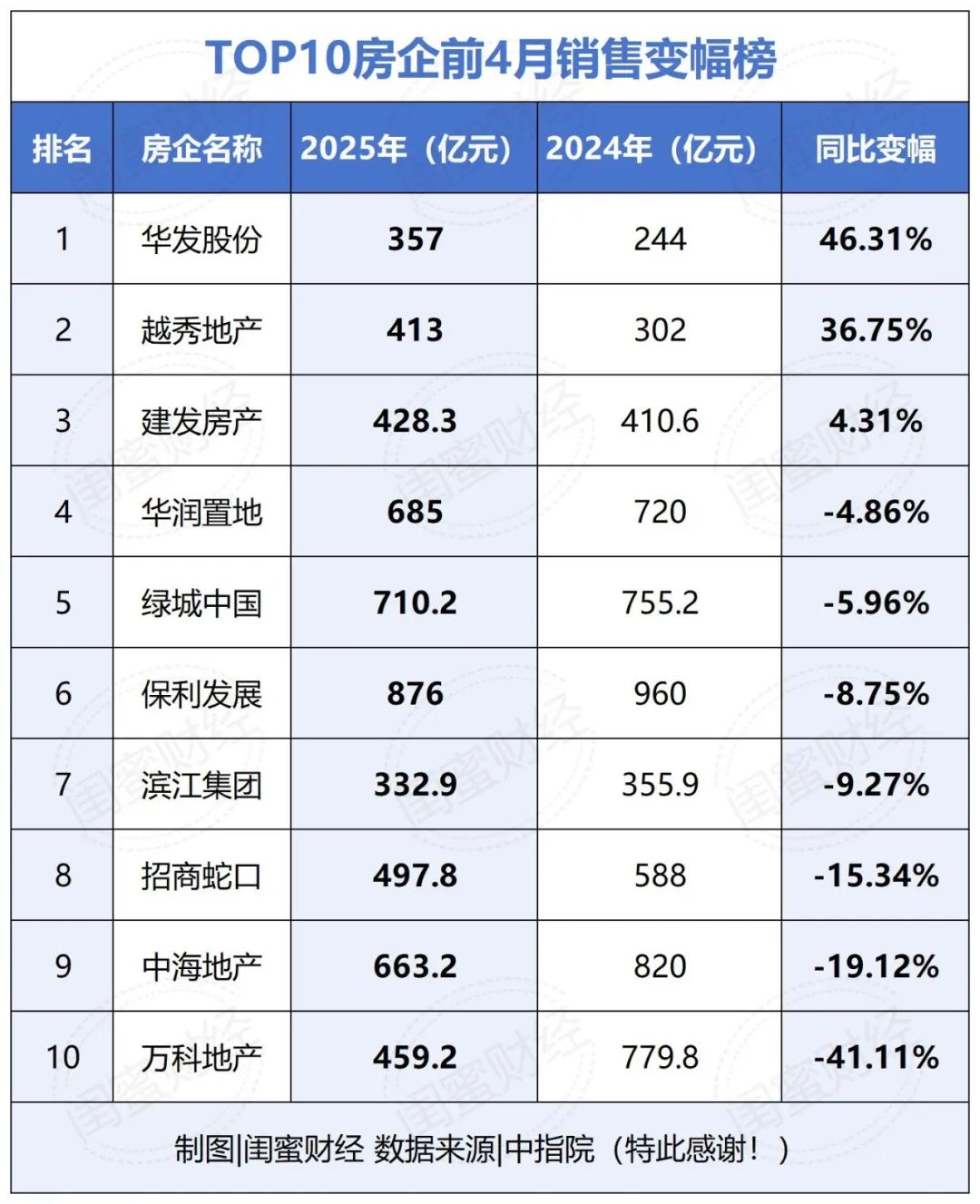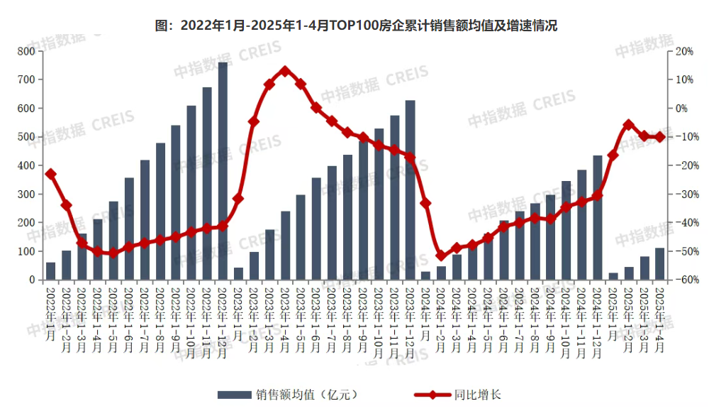 随着4月落幕,5月各大房企的销售数据榜单也已经披露。根据中指院数据,2025年前4月,TOP100房企销售总额11198.6亿元,同比下降10.2%,降幅较1-3月基本持平。4月单月,TOP100房企销售额同比下降16.9%,较3月单月降幅有所扩大。