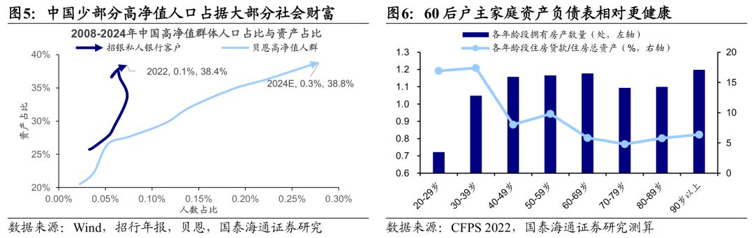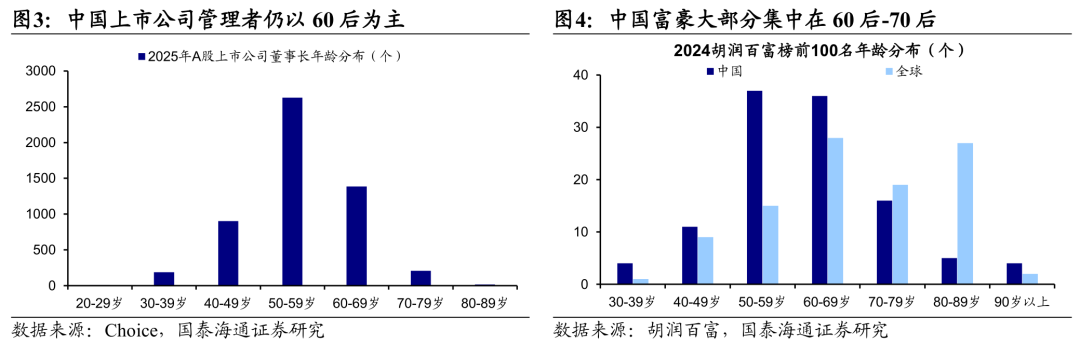 其次,胡润富豪榜上60后占比最高。根据2024年胡润百富榜,全球富豪主要集中在60-89岁,共73人。相比之下,我国富豪年龄更集中且偏年轻,中国百强富豪中50-69岁亦有73人。另据招商银行与贝恩公司报告,2024年我国约0.3%的高净值人群持有38.8%的社会财富。由此可见,60后不仅在富豪榜上占据主导地位,也掌握着社会财富的主要份额。