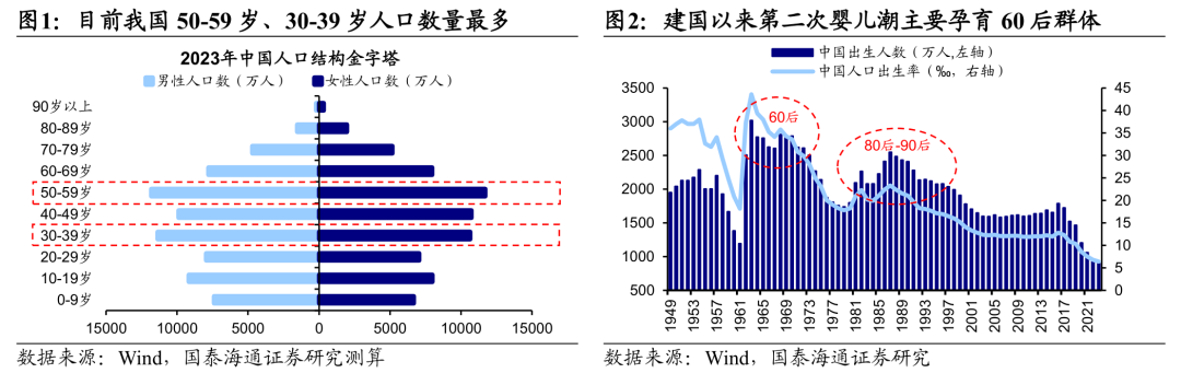 人口结构:60后群体是当前中国人口中最为庞大的一代。根据国家统计局人口抽样调查数据,按每10年为一代划分,截至2023年底,我国50-59岁人群数量最多,达2.4亿人,占总人口的16.5%;其次是30-39岁人群,数量约2.2亿,占比15.5%。这两个年龄段分别对应了建国以来的第二次与第三次婴儿潮:1)1962 -1973年是我国人口增长最快的时期,三年自然灾害结束后,经济形势逐步改善,带来一轮补偿性生育高峰。在此阶段,年均出生人口稳定在2500-3000万人,形成了“60后”这一超大规模群体;2)此后,随着60后一代进入生育年龄,1981-1997年迎来“回声婴儿潮”。尽管受1978年计划生育写入宪法影响,此阶段出生人口有所下滑,但年均出生人数依然维持在2000-2500万人,孕育了如今的“80后”“90后”。这两次婴儿潮对我国人口结构产生了深远影响,其中诞生于第二次婴儿潮的60后群体,是我国当代人口格局中规模最大的代际群体。