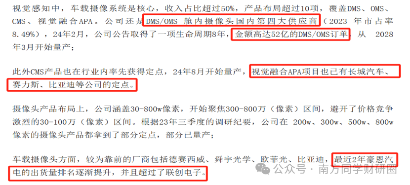 之前的分析提到摄像头这块的亮点,首先是出货量排名这两年在提升,其次是一些高附加值,高毛利率的产品也获得了大单(长周期),比如DMS\OMS等,而且公司在这类细分领域属于国内第四大厂商。