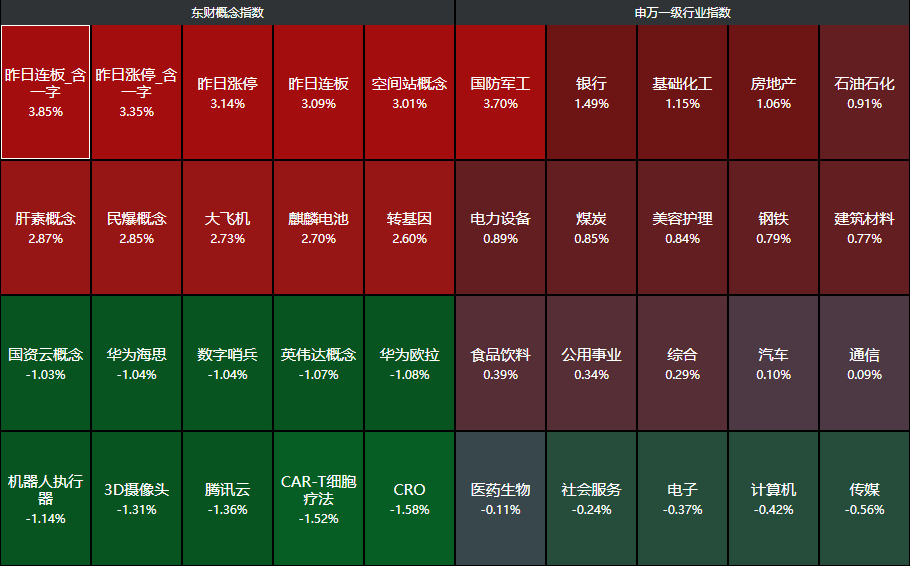分行业来看,国防军工、银行、基础化工、房地产、石油石化等行业领涨,传媒、计算机、电子等行业领跌。