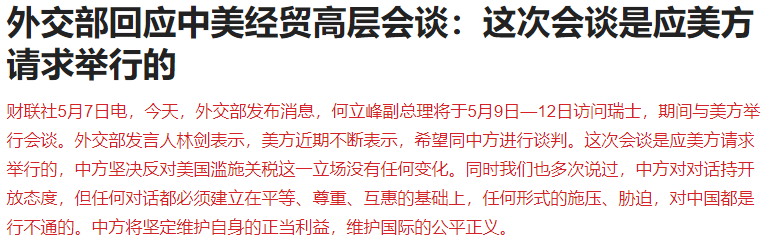 外交部回应中美经贸高层会谈:这次会谈是应美方请求举行的。