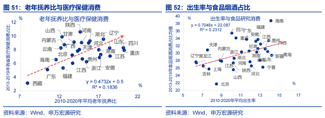 “一老一小”补贴支持下,中西部地区或更受益,母婴食品等刚需品类、医疗保健消费或更受益。通过计算省级层面不同年龄段人口占比与消费结构的相关系数可看到,0-20岁人口对食品烟酒类消费的拉动显著,如西藏(43.8%)、海南(38.8%)、四川(35.4%)等省消费支出中食品烟酒占比明显偏高(全国为29.8%);其中,食品类为主,其中涵盖肉蛋奶、糖果零食等。在老年抚养比较高的地区,医疗保健支出占比也较高,譬如陕西(14.6%)、山西(12.3%)等省老年抚养比较高,相应医疗保健消费支出占比分别是10.6%、9.9%,居于全国前列。