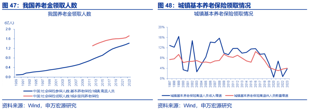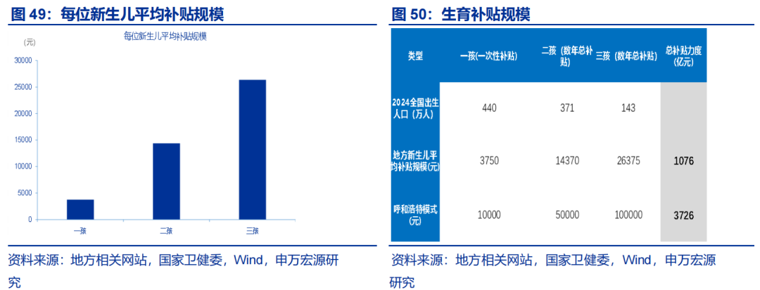 改善收入分配机制、加强社会保障等机制性政策或在中长期发挥更大作用。一方面提高养老补贴水平,或是居民长期“增收”的可能来源。根据当前养老金领取人员测算,若适当提高退休人员基本养老金,假设每位退休人员每月收入增加100元,则全年城镇职工基本养老保险或多支出1700多亿元;适当提高城乡居民基础养老金,假设每月增加100元,则全年城乡居民养老保险或多支出约2100亿元。另一方面,若参照呼和浩特最新阶梯式育儿补贴政策,全国新生儿生育补贴总规模或超3700亿元;若按照地区间平均水平全国推广,则所需财政资金或在1076亿元左右。