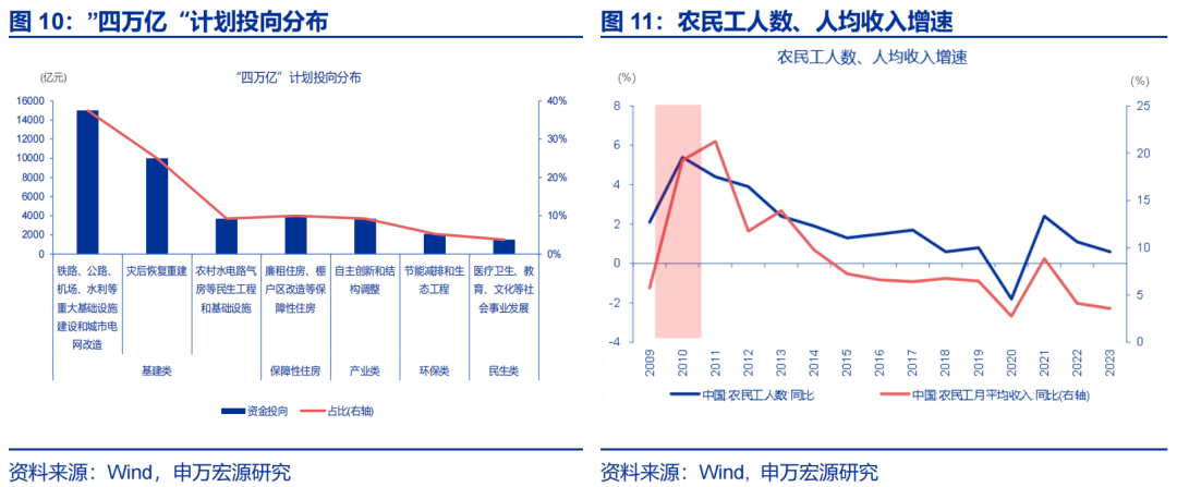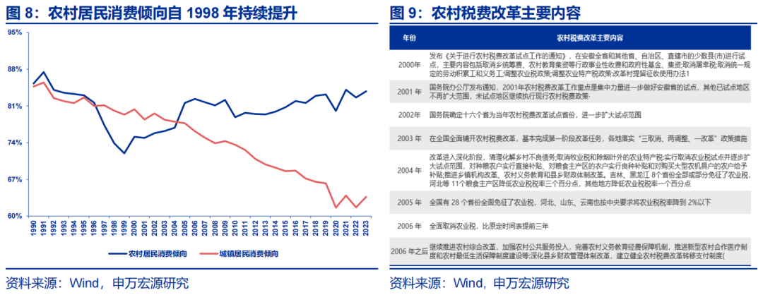 长期制度改革的“减负”、“增收“也有效提升农村居民消费能力和意愿。1998年以来,中央工作重心转向农村税费改革,包括取消乡统筹费、农村教育集资等。据统计,2006年全面取消农业税后,与1999年相比,全国农民一年减轻负担约1250亿元,人均减负约140元(占当年农村人均纯收入的5%)。同时2008年底开启的“四万亿”稳增长计划为农民工群体带来“增收”,“四万亿”计划带动下,2010-2011年期间农民工人数、农民工人均收入增速大幅提升,同比分别4.9%、20.3%,较2009年上行2.8、14.5个百分点,进一步从收入端提升农村居民消费能力。