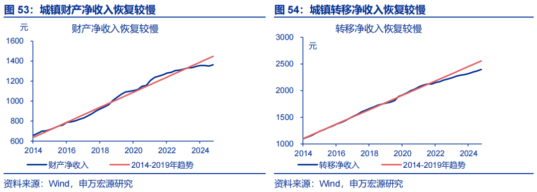 此外居民财产净收入恢复偏慢,“稳住楼市股市”亦有助于居民报表修复,提振消费信心。2025年政府工作报告,首次将“稳住楼市股市”写进总体要求,强调“更大力度促进楼市股市健康发展”。考虑到当前,城镇居民财产净收入恢复较慢,且资产负债表中住房占比近六成,“稳住楼市股市”或不仅是针对居民资产负债表,亦是增强居民财富效应、改善预期促进消费。