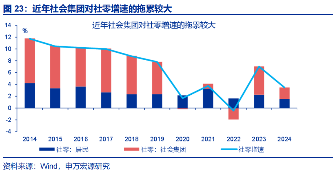 社会集团消费复苏缓慢,是扰动社会消费弹性的另一来源。在将社零分拆成居民消费和社会集团消费后,可以观察到疫情以来社会集团消费是持续拖累整体社零的重要来源。2024年社会集团在全社会消费中占比高达55.7%,但其消费增速较2019年回落5.8个百分点至3.5%,对社零的拉动也由5.5%降至1.9%,是主要拖累项。