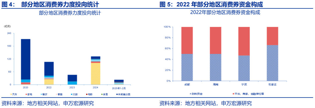地方促消费以消费券为主、支持领域更多元。2020年以来,地方政府依据本地特色服务产业,如文旅、餐饮、文体娱乐等,定向发放消费券。多地根据旅游景区、酒店住宿等细分场景,设定不同面额消费券,游客预订相关服务时直接抵扣,刺激文旅市场复苏。餐饮消费券则常以满减形式发放,鼓励消费者线下堂食,带动线下服务行业的消费活力。部分地区消费券资金来源不仅包含地方财政,亦有商家平台和金融机构参与,且对家电、汽车等商品消费和食宿文旅等服务消费均有支持。