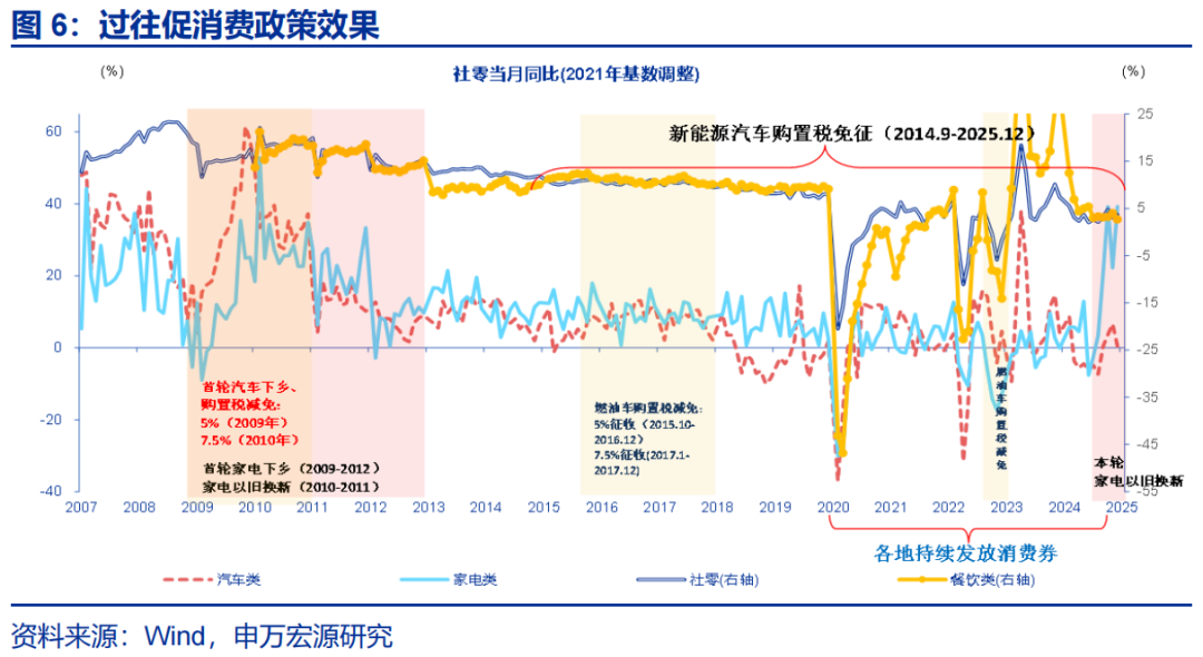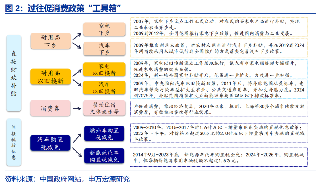 稳增长压力较大、外需承压时期,扩内需、促消费通常成为政策重要着力点。我国促消费政策,或可分为直接财政补贴,例如下乡补贴(2009-2012年)、以旧换新补贴(首轮2010-2012年、新一轮为2024年以来)、消费券(2020年以来)等;间接支持政策,典型如汽车购置税减免(燃油车为2009-2010年、2015-2017年、2022年下半年)、假期高速公路通行费减免等。