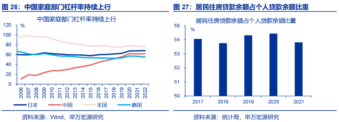 居民债务负担持续增大,而住房贷款占比超过一半,令居民杠杆对房价的敏感度过高。不同于海外主要经济体2010年后家庭部门杠杆率回落,我国家庭部门杠杆率则呈现单边上行态势,自2010年的27.3%持续提升至2022年61.6%、反超德国(55%),也仅低于日本6.5pct。其中,住房贷款是债务负担的主要来源,2021年占比高达53.8%,导致居民杠杆率对房价波动的敏感度显著提高。
