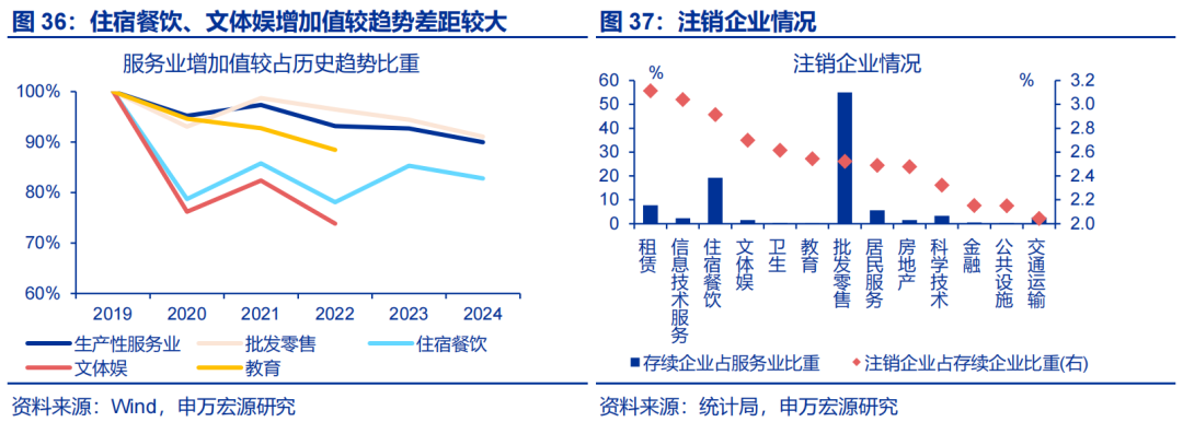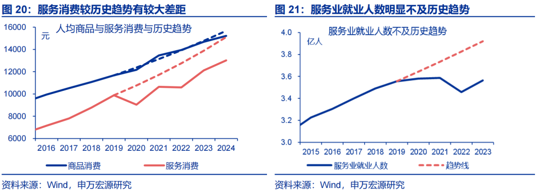 服务业是非贸易部门,有效供给不足会对消费构成额外拖累,反映前期地方行政管制、部分企业倒闭的影响。服务业是非贸易部门,并不存在库存。换言之,供给与需求相等。因此,若服务业供给质量与数量较差,亦会拖累需求。目前该现象已有体现,人均商品消费已恢复至历史趋势附近,但服务消费仅历史趋势的87.7%,恰恰是供给端的拖累。以就业人口衡量,2023年服务业就业人数占劳动力人口比重保持不变,而受需求影响的服务业增加值在GDP中占比的上升幅度(+1.4pct)。CPI数据亦能反映,商品消费需求较强但核心商品CPI偏低,服务消费需求偏弱但核心服务CPI偏强(0.5%),说明制造业产能过剩压制商品CPI,但服务业供给不足背景下CPI读数并不低。结构上,教育、文化体育娱乐、住宿等供给恢复较慢。