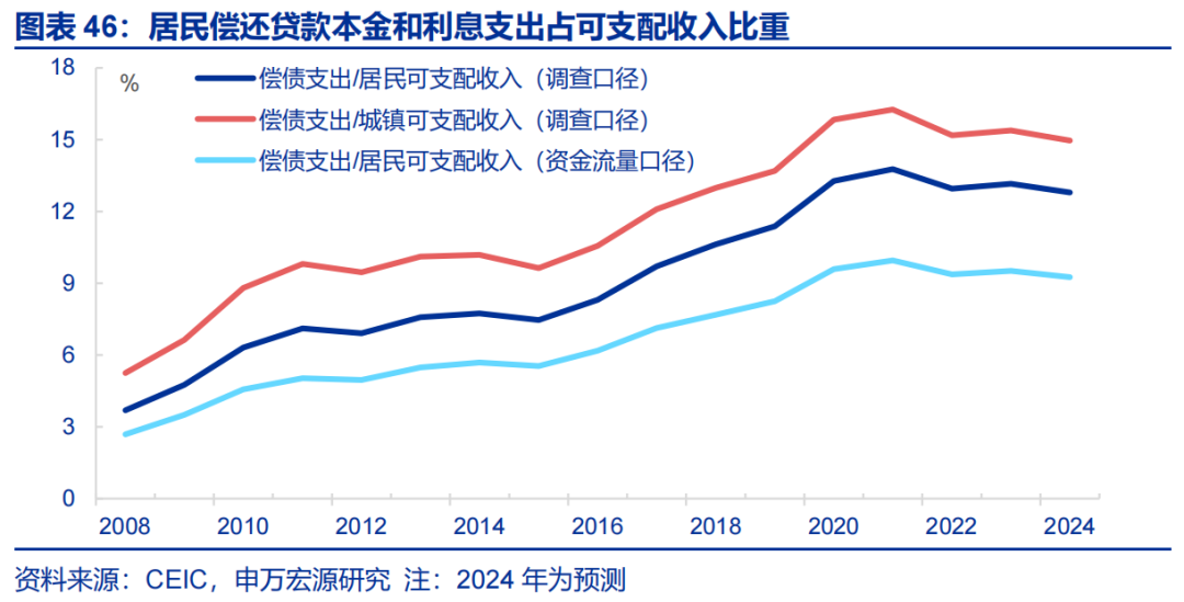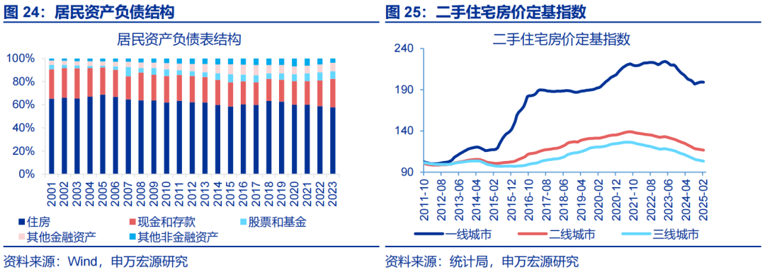 报表视角下,住房在居民资产中占比近六成,近年房价已有明显回调,对居民资产负债表冲击较大。2023年,房地产在居民资产中占比为57.8%,而过去几年房价持续回落;2025年3月一线、二线、三线城市房价已分别较最高点回落11.1、16.2、18.6pct,特别是二线、三线城市房价已降至2017年水平,直接导致居民部门资产缩水。参考企业资产负债表需要修复两年的经验看,居民部门过去几年受到的冲击也需要时间修复。