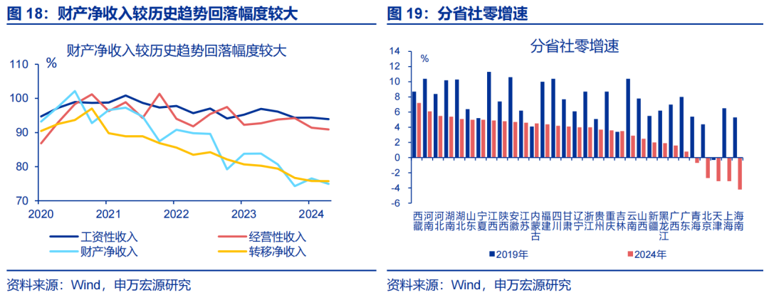 居民收入恢复偏慢对消费形成较大约束,结构上财产性收入维持低位、东部地区收入增速更低。目前财产性收入、转移性收入恢复进度均只有疫情前75%左右,是约束居民消费的核心来源。区域上表现为以上海、北京为代表的东部地区收入增速在4%左右,相应地区社零增速也明显偏低。从消费占比看,消费占比高的东部地区收入、消费降幅均较明显,而消费占比低的中西部地区消费增速却高。