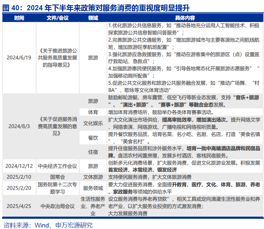 政策关于促消费的重心已向服务消费倾斜,后续可加大补贴,提高供需适配度。2024年下半年以来,政策对服务消费的关注度提升。2025年4月中央政治局会议再次强调“大力发展服务消费”,提出“设立服务消费与养老再贷款”,相关工具或定向滴灌生活性服务业和养老产业,以扩大服务业投资的方式激发消费。服务消费促进类政策后续或围绕两方面,一是在需求端补贴,可能侧重餐饮、住宿、旅游等方面;二是提高供给适配度,加速优质服务供给,可能侧重教育、文化娱乐、家政养老等领域。而“提高中低收入群体收入”将发挥稳定整体消费效果。