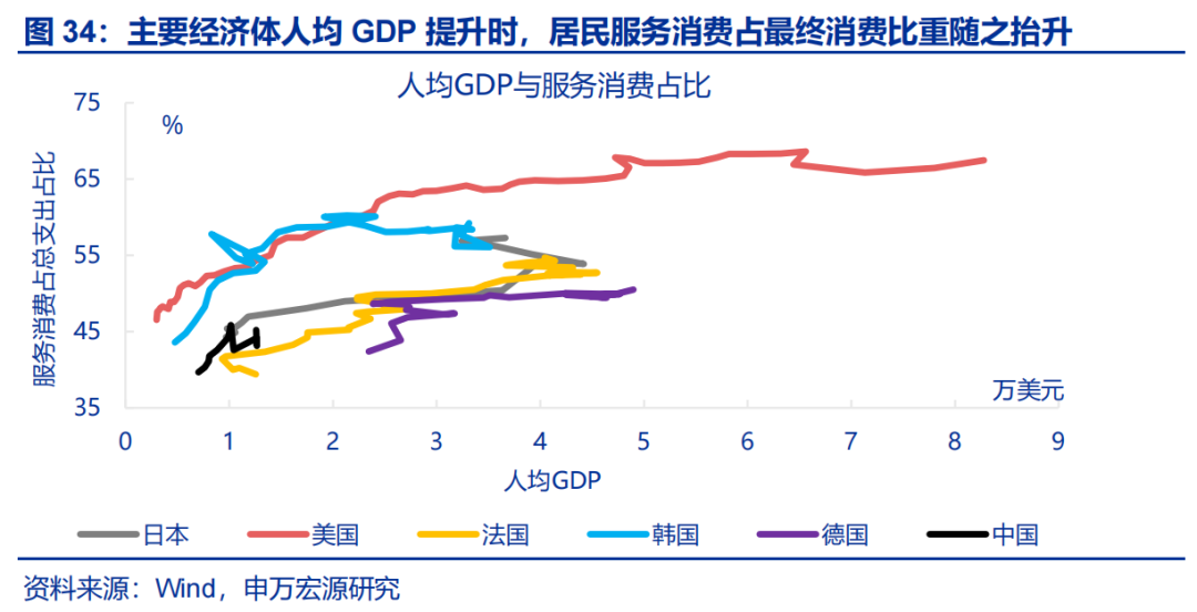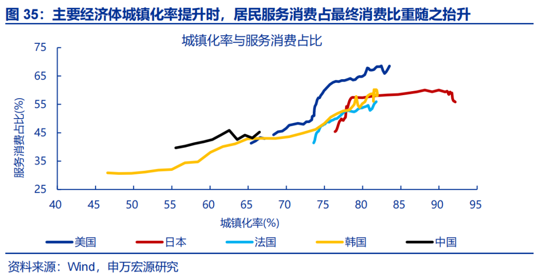 从海外经验看,人均GDP达到1-3万美元、城镇化率达到70%附近时,人均消费偏好会加快向服务消费转型。主要经济体消费占比绝对水平不同,但在人均GDP1-3万美元时,服务消费在消费中占比提升的斜率高度一致(年均+0.6个百分点)。此外,在城镇化率达到70%附近时,服务消费占比提升斜率也同时上升至年均上行0.6个百分点。反映进城之前居民更多消费商品,进城以后居民更多消费服务。从国内经验看,人均GDP增速较高的省份,服务消费增速也更高。