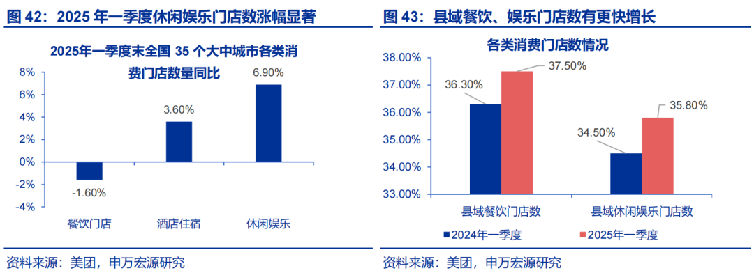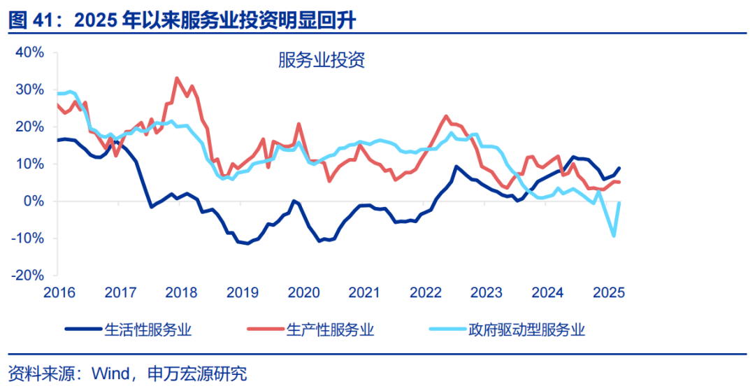 加码服务业投资(“消费类基建”)也是促消费的抓手之一,同时也兼具对冲外需走弱的短期效果。2025年《政府工作报告》首次提及“加大服务业投资力度”,而从服务业投资分类来看,多为消费场景的建设,譬如文体娱投资(体育馆、展览馆)、教育、社会保障、卫生医疗养老、住宿、批发零售业(大型商场)等,也即“消费类基建”。而从资金来源来看,该投资其一是企业层面自有资金,其二是财政一般预算支出中科教卫社保文娱支出,该资金并不受基金预算的化债约束。从数据上来看,2024年下半年服务业投资增速由10%下行至年底-2%附近,但今年大幅反弹至5%以上。微观数据如文化娱乐等门店数今年一季度增速保持较高正增长(6.9%)。