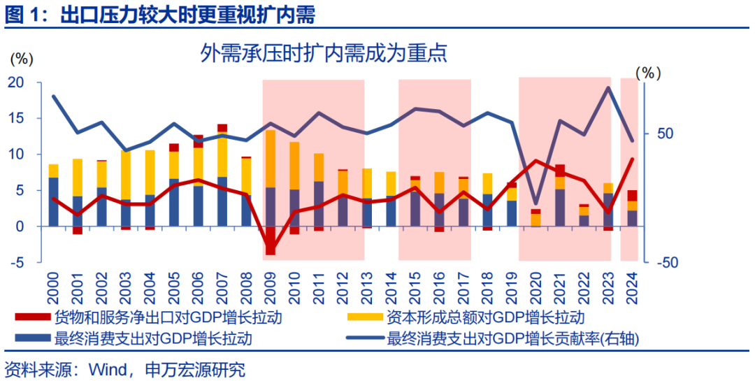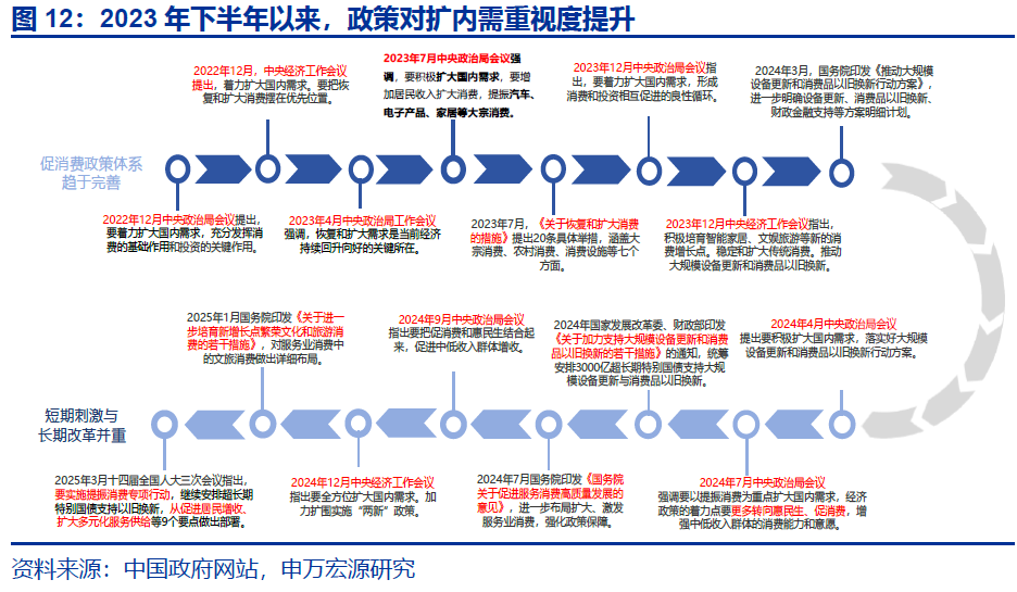 2023年底以来,政策对扩内需、促消费重视度明显提升。2023年7月《关于恢复和扩大消费的措施》构建“一揽子”促消费政策体系,标志着扩内需从单一刺激转向系统性政策部署。2024年3月新一轮全国层面消费品以旧换新政策出台,7月中央财政加码1500亿元支持,其后9月和12月中央政治局会议及中央经济工作会议均将“大力提振消费“放在首位。这一过程中,政策逐步更加强调居民收入增长、社会保障完善,体现了扩内需不仅是短期刺激,更是长期战略。