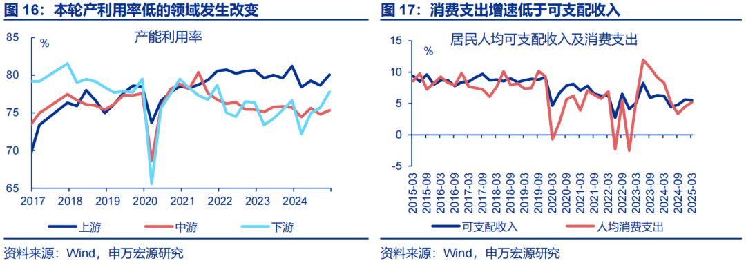 中长期来看,消费增速决定了经济增速基准,“促消费”的重要性越发凸显。工业化率见顶后,投资对经济的贡献会逐步下降,而消费的贡献抬升。但2020年后过剩产能行业从中上游向中下游转变,而中下游恰恰又是吸纳就业的重镇,导致居民可支配收入与消费支出增速均出现明显回落。2024年Q3以来,居民消费信心不足,消费支出表现(3.4%)开始弱于可支配收入(4.8%)。需打破收入、消费、就业螺旋式“收缩”,经济或才能重新回到健康发展的轨道上。