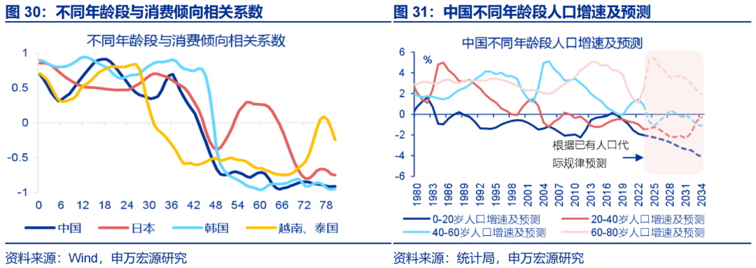 从人口结构看,中青年消费倾向最高;但人口结构老化,会对未来一段时期全社会消费倾向的提升不利。对比不同年龄段与消费倾向相关系数看,40岁以下群体是消费主要群体,也是当下新消费(情绪消费等)主要群体,而中老年人口占比增多会抑制居民消费意愿。但从未来十年人口走势来看,中青年人口增速会持续下滑,尤其20岁以下的群体最为突出(人口增速,平均-3%);而老年人口却保持正增长(3.6%),老龄化情况进一步加深约束消费倾向提升。