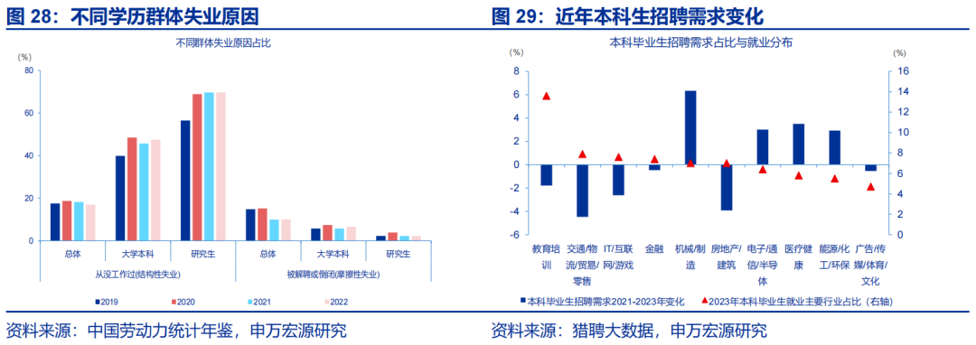 中期来看,居民报表受损、结构性失业也约束消费回升。住房在居民资产中占比近六成,住房贷款在总贷款占比高达53.8%;而过去几年房价持续回落,直接导致居民部门资产缩水。同时,结构性失业也制约居民消费能力和信心,形成“就业弱→消费弱”的传导机制;本科生、研究生等高学历群体由于产业调整带来的传统服务业招聘需求收缩,2019-2022年失业占比分别上行5、1.4pct。