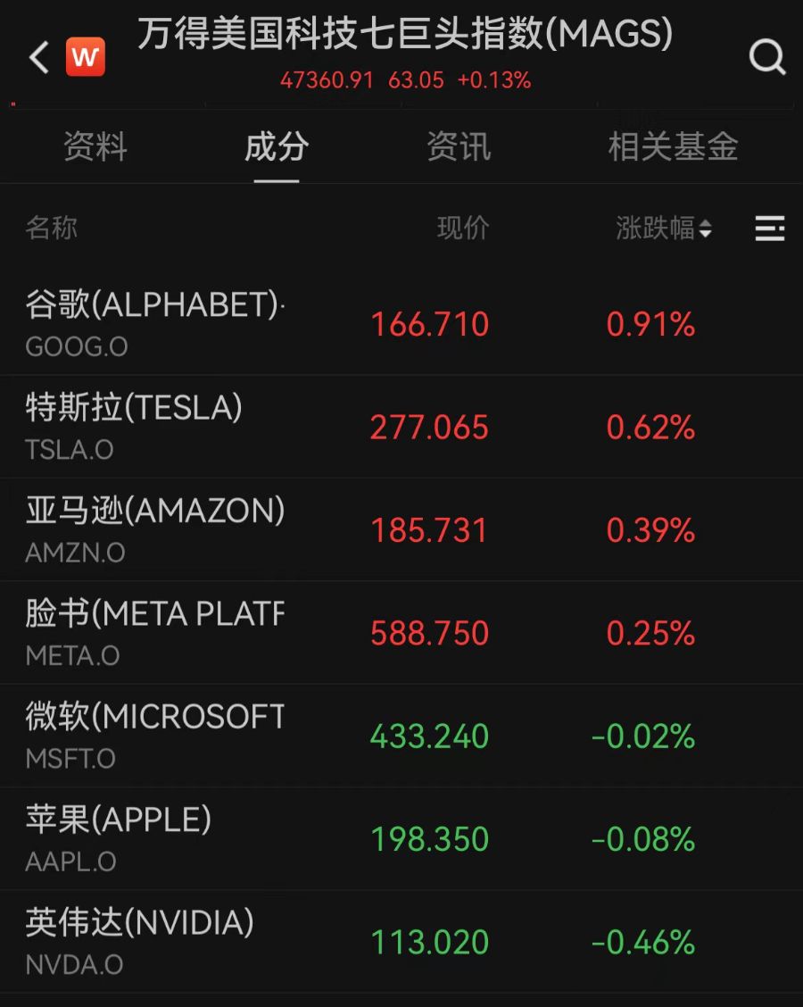 大型科技股涨跌不一,谷歌、特斯拉、亚马逊、脸书等小幅上涨,微软、苹果、英伟达分别下跌0.02%、0.08%、0.46%。