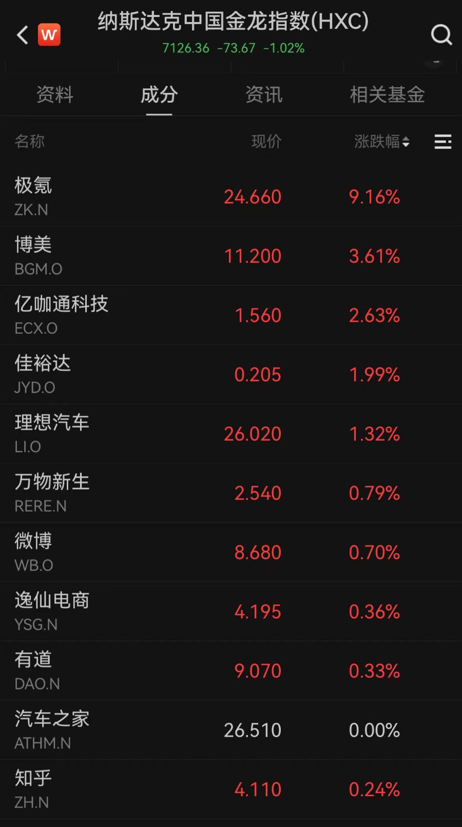 纳斯达克中国金龙指数下跌1.02%。个股方面,极氪以9.16%的涨幅领涨,理想汽车、博美跟涨;金山云、名创优品、百度集团、虎牙直播跌超3%。