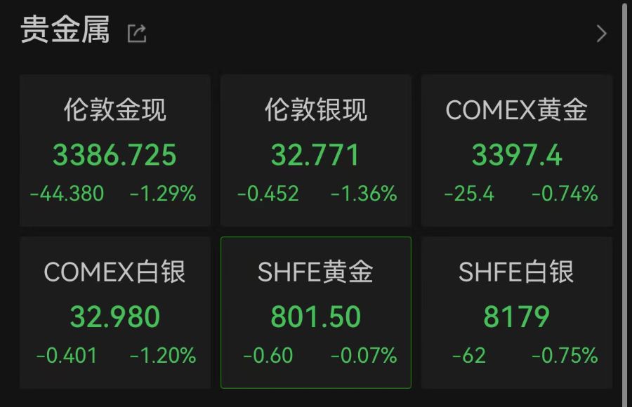 国际金价再度迎来大幅调整。伦敦金现下跌1.29%,报3386.72美元/盎司,再次跌破3390关口;COMEX黄金期货价格下跌0.74%,报3397.4美元/盎司。