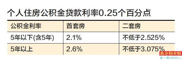5月7日,中国人民银行发布关于下调个人住房公积金贷款利率的通知。自5月8日起,下调个人住房公积金贷款利率0.25个百分点,5年以下(含5年)和5年以上首套个人住房公积金贷款利率分别调整为2.1%和2.6%,5年以下(含5年)和5年以上第二套个人住房公积金贷款利率分别调整为不低于2.525%和3.075%。