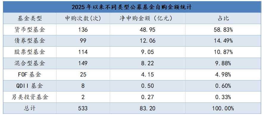 股票型基金和混合型基金自购金额“旗鼓相当”,年内公募机构自购旗下股票型基金和混合型基金的次数分别为114次和149次,净申购金额则分别为9.05亿元和8.22亿元,占比分别为10.87%和9.88%。