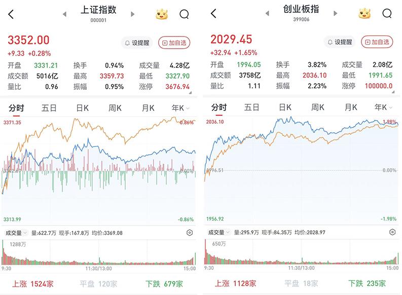 至收盘,上证综指涨0.28%,报3352点;科创50指数跌0.36%,报1026.44点;深证成指涨0.93%,报10197.66点;创业板指涨1.65%,报2029.45点。