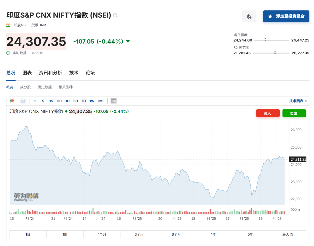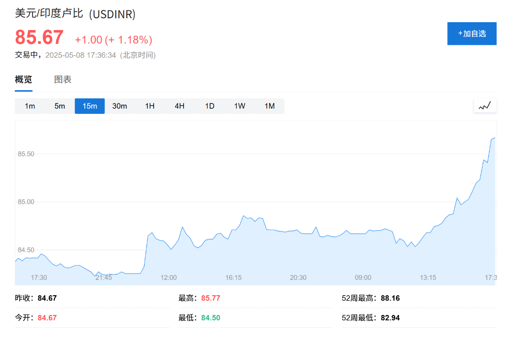 与此同时,印度Nifty 50指数跌幅扩大至0.5%。印度恐慌指数跃升至21.48,为4月9日以来的最高水平。