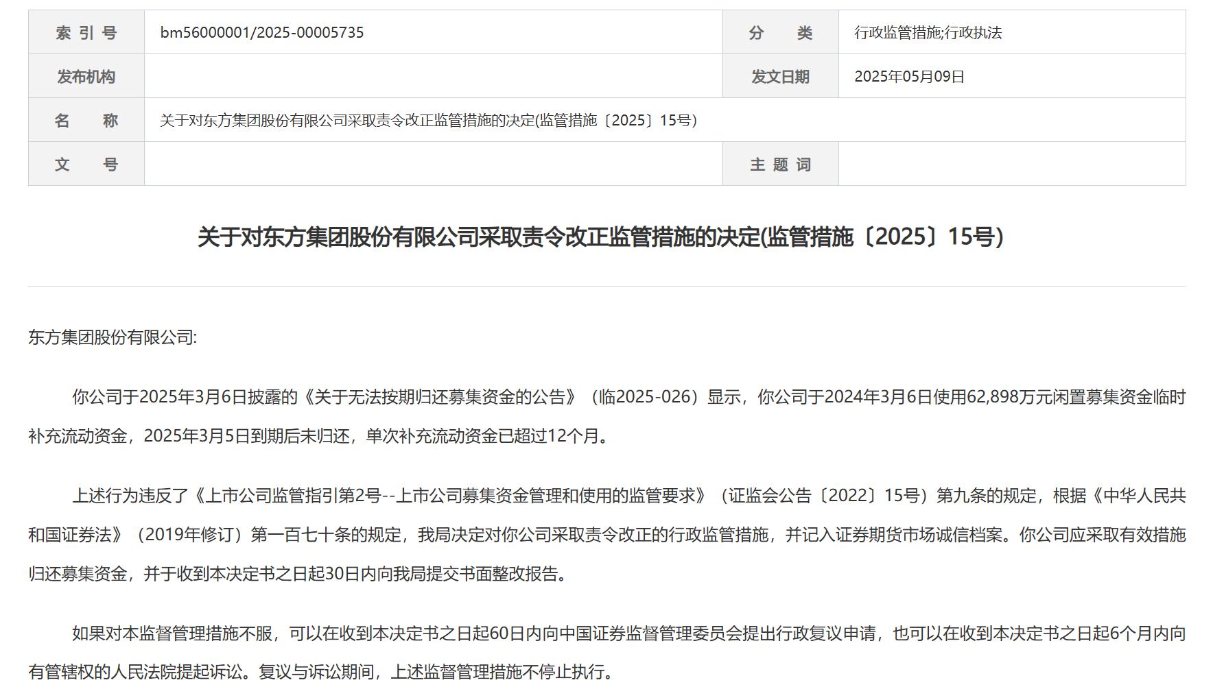 黑龙江证监局指出,东方集团于2025年3月6日披露的《关于无法按期归还募集资金的公告》(临2025-026)显示,公司于2024年3月6日使用62898万元闲置募集资金临时补充流动资金,2025年3月5日到期后未归还,单次补充流动资金已超过12个月。