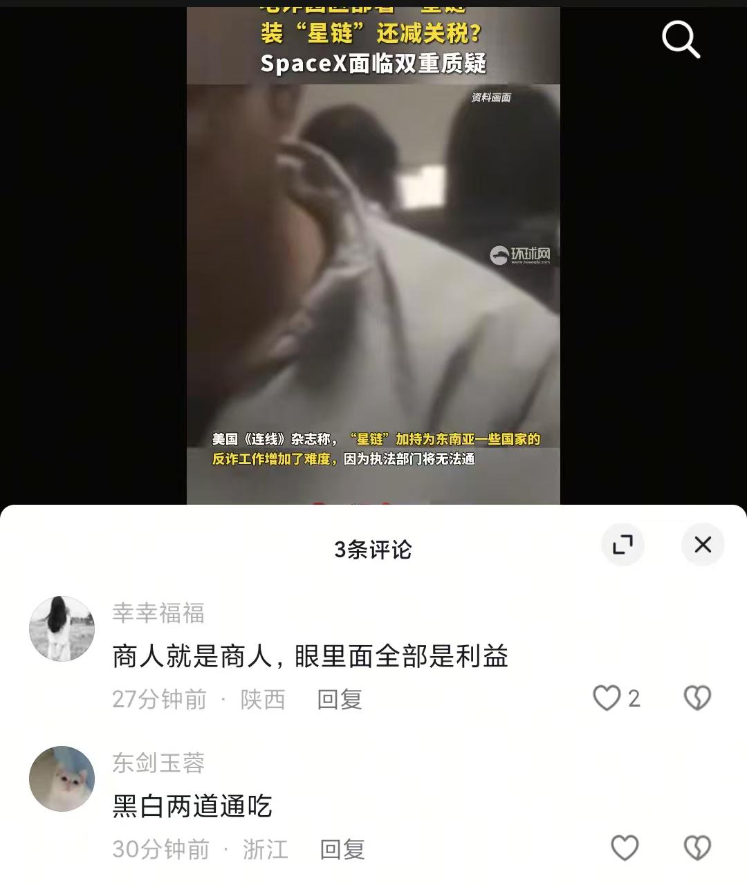 对于“星链”设备被电诈利用,不少网友将矛头指向马斯克,更有网友认为马斯克“黑白两道通吃”。也有网友辣评:“商人就是商人,眼里面全部是利益。”