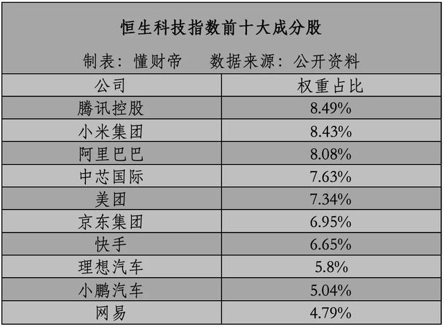 从指数的前十大成分股来看,既有上游的芯片公司中芯国际,也有腾讯、阿里等科技巨头,还有小米、理想、小鹏等智能终端公司,以及美团、京东等零售巨头。
