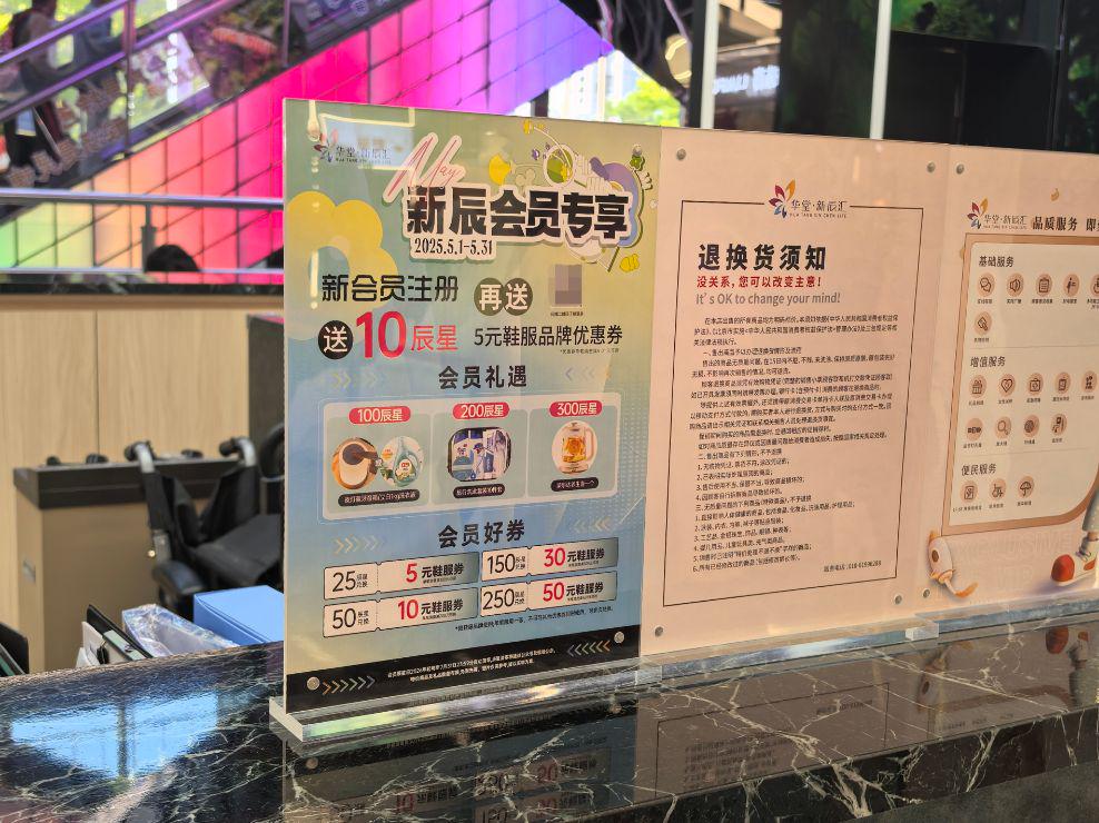 据工作人员介绍,商场在5月1日至31日期间推出新会员注册优惠活动。消费者注册新辰会员并进行消费后,可凭累计积分换取洗衣液、养生壶等礼品,也可用于兑换鞋服品牌优惠券,新会员还可额外获赠积分和优惠券。