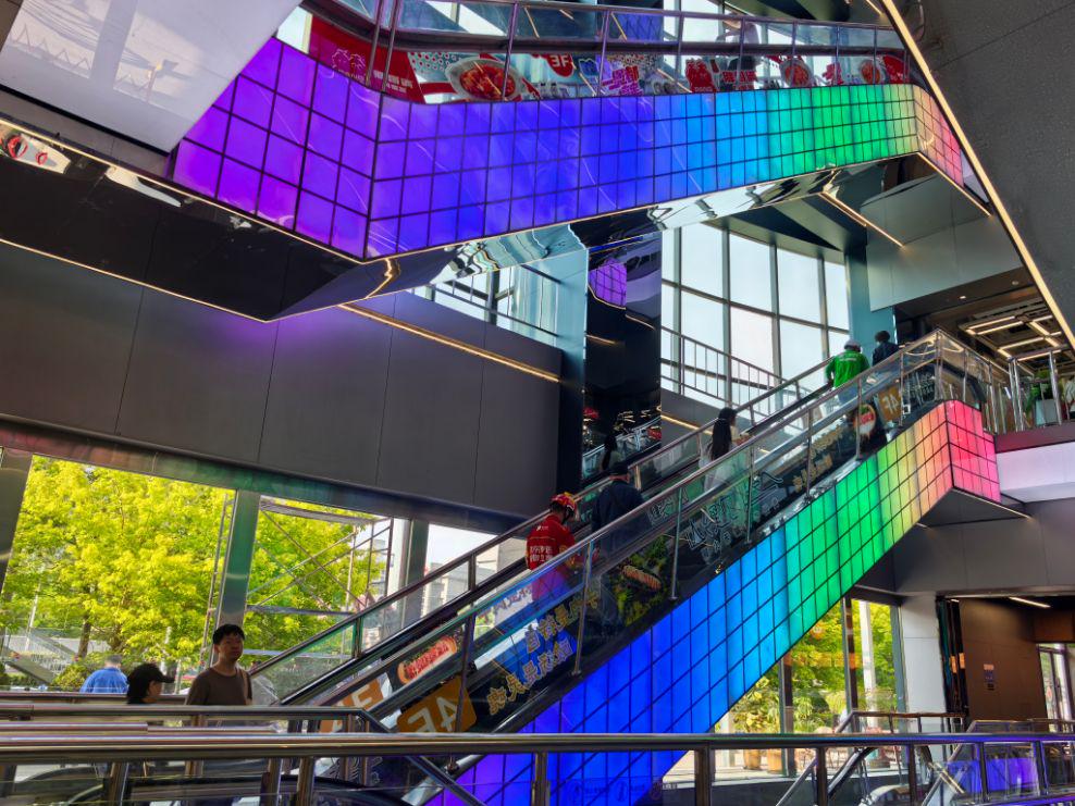 更新后,商场为手扶梯设置了七彩灯光效果。