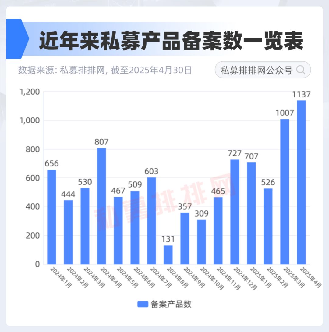 私募排排网数据显示,4月共有1137只证券类私募产品备案(来自635家私募),环比3月的1007只增长12.91%,再度创出年内新高。